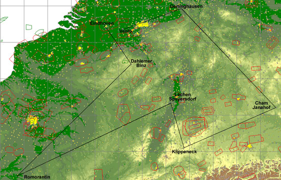 Once you've flown the Euroglide, there is no other contest that is more fun to fly. No boring one day tasks that bring you back to the aerodrome of origin (if all goes well), but a multiple day task of more than 2000 km. The task for this year (2002) was 2213 km and covered large parts of Germany and France (see route below).